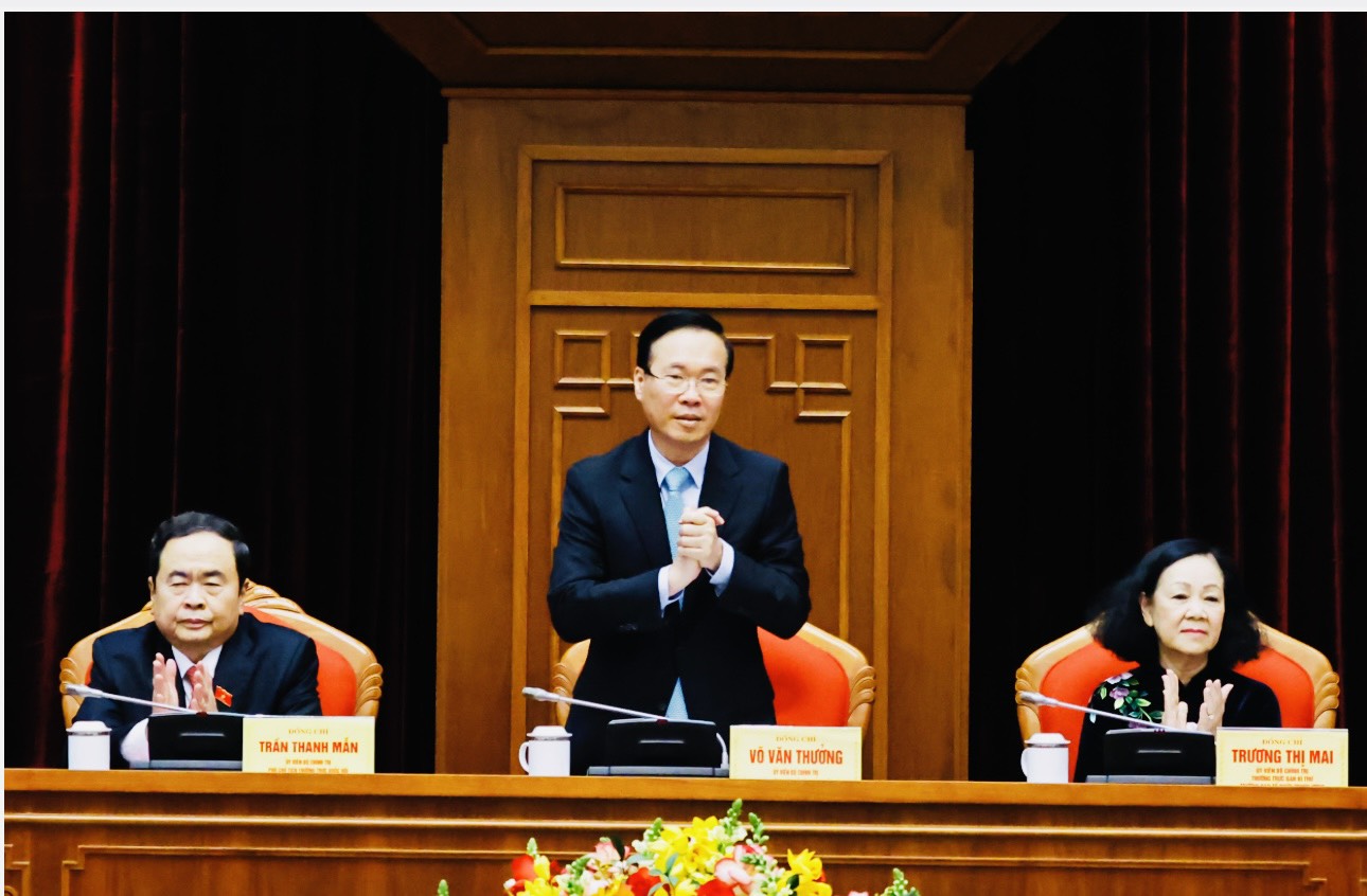 Phát biểu tại Hội nghị, Chủ tịch nước Võ Văn Thưởng đánh giá cao các ý kiến tâm huyết, trách nhiệm, nặng lòng với đất nước, thể hiện tin tưởng vào sự lãnh đạo của Đảng và những hiến kế quý báu của các đại biểu cho Đảng, Nhà nước để tiếp tục lãnh đạo, chỉ đạo đất nước ta ngày càng đổi mới và phát triển bền vững.