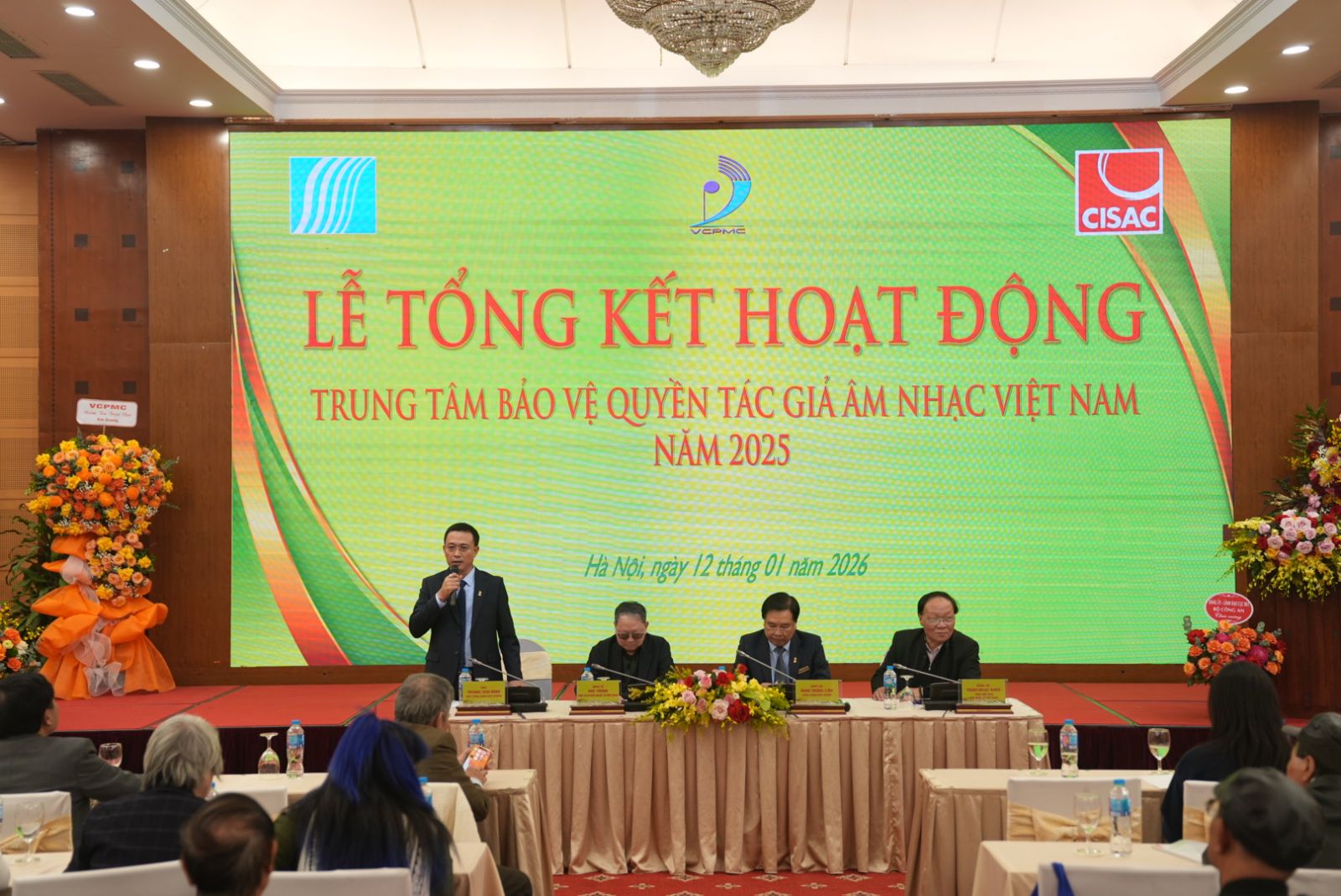 Nhạc sĩ Đinh Trung Cẩn – Tổng Giám đốc Trung tâm Bảo vệ quyền tác giả âm nhạc Việt Nam chia sẻ thông tin tại lễ tổng kết. Ảnh: VCPMC