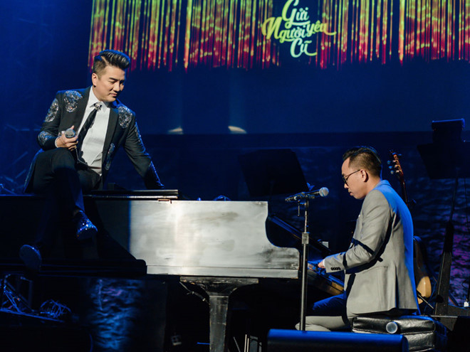 Nhạc sĩ Nguyễn Hồng Thuận đệm đàn cho Đàm Vĩnh Hưng trái thể hiện ca khúc của mình. Ảnh:NSCC