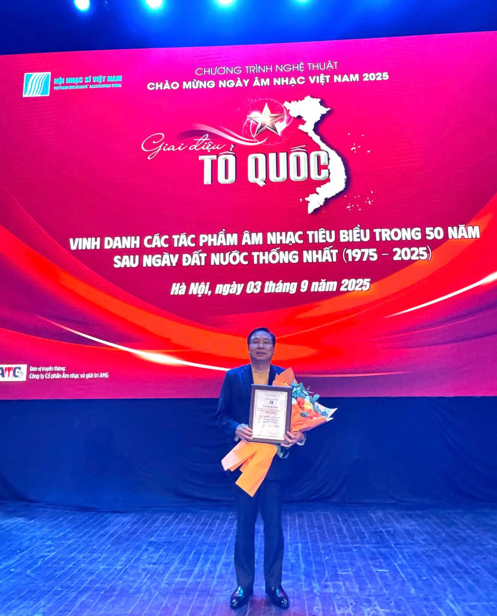 Trong khuôn khổ chương trình nghệ thuật “Giai điệu Tổ quốc,” Hội Nhạc sỹ Việt Nam đã tổ chức vinh danh và trao bằng chứng nhận cho 55 tác phẩm âm nhạc tiêu biểu giai đoạn 1975-2025, gồm 50 ca khúc tiêu biểu và 5 tác phẩm giao hưởng thính phòng tiêu biểu.